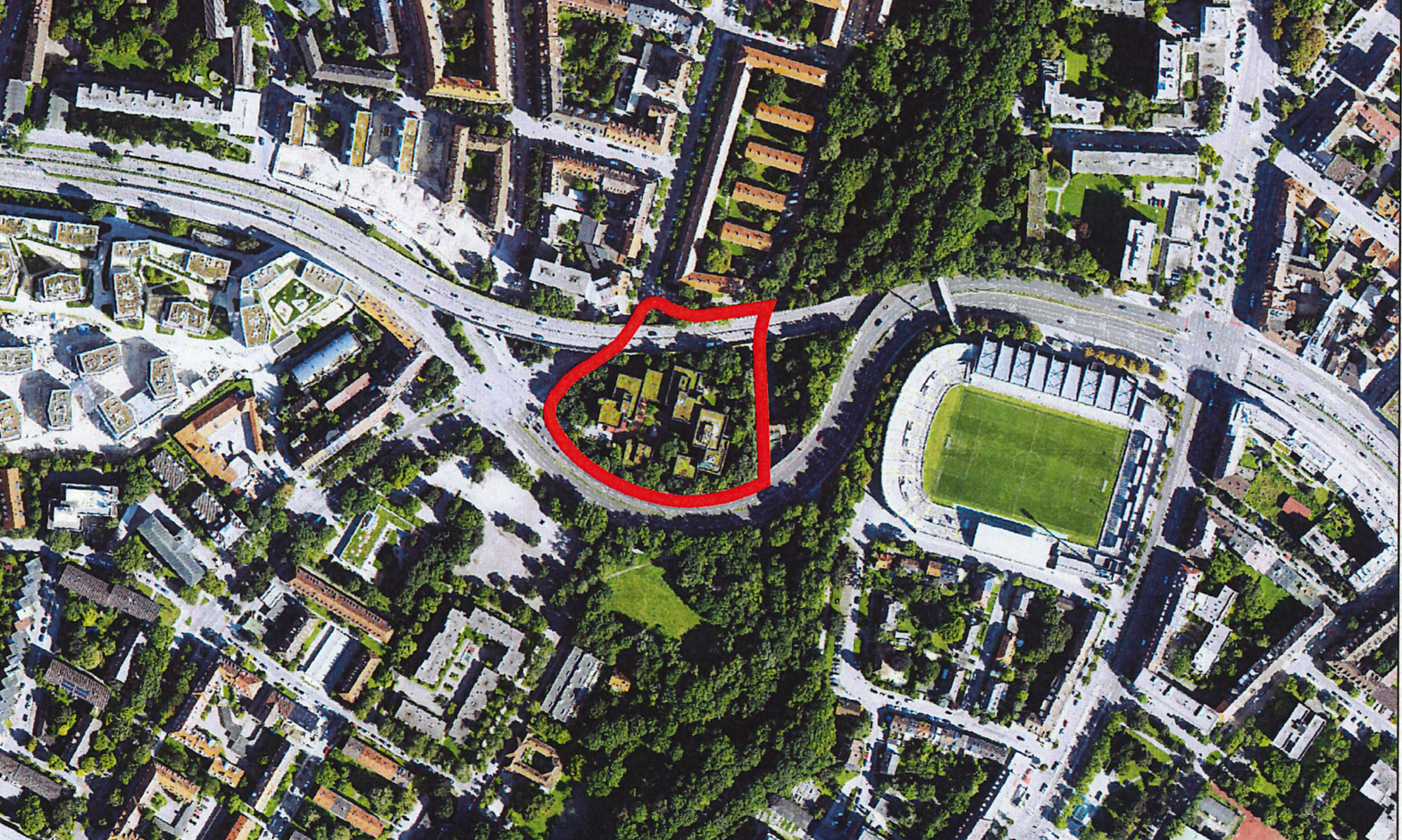 Eine weitere, senkrechte Luftaufnahme aus der Vorlage zeigt noch genauer, wie eingeklemmt der Baugrund zwischen dem Mittleren Ring (oben) und der Candidstraße (unten) liegt: