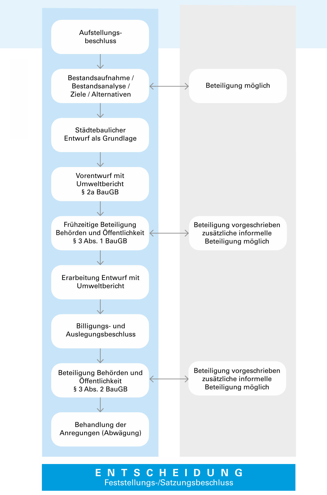 Gegenstand der Debatte im Stadtrat war ein sogenannter Aufstellungsbeschluss in Reaktion auf einen Antrag des Investors. Damit wird der Startschuss für den eigentlichen Beginn der städtischen Bauleitplanung gegeben. Das folgende Diagramm zeigt das weitere Verfahren: