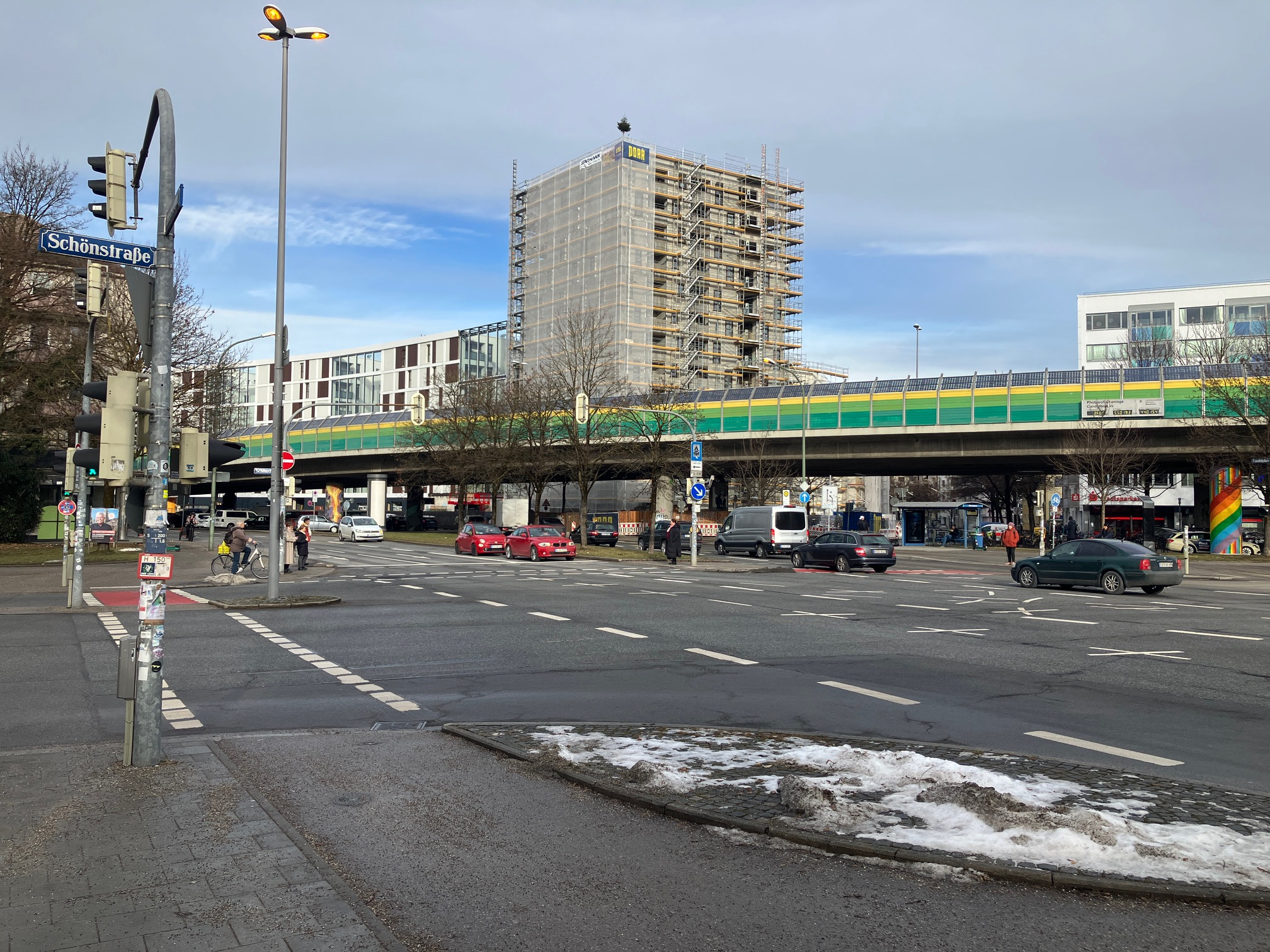 Schön ist es hier nicht, eher zweckmäßig mit viel Verkehr, sowohl auf als auch unter dem Mittleren Ring. Die Bebauung ist unterschiedlich hoch und ohne jeglichen architektonischen Anspruch. Das im Bau befindliche Wohngebäude im Nordwesten hat eine Höhe von etwa 40m.